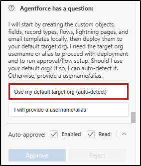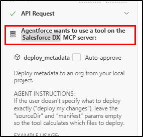 Now Agentforce wanted to use a tool on the Salesforce DX MCP server to create the custom objects, fields, etc locally.