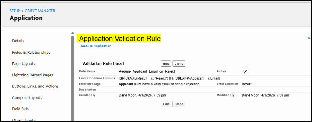 A validation rule to ensure an applicant has an email address (otherwise, a reject/accept email will fail). Agentforce decided this was necessary without any prompting from me.
