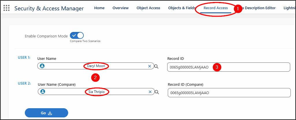 Starting with the Record Access app (1), we choose two users (2) and the ID of a record we want to inspect. (3).