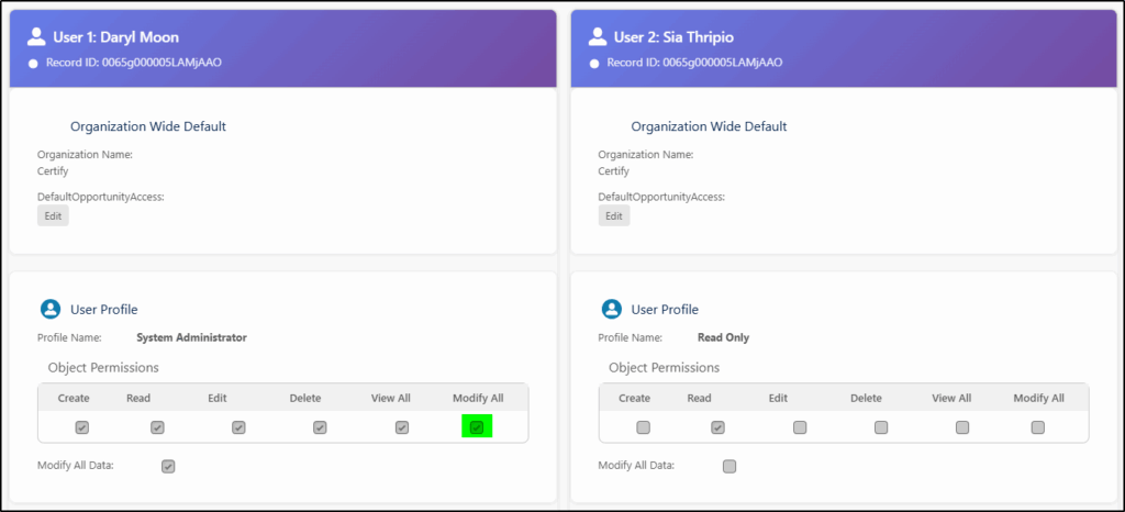 Let’s compare two users and see how we can combine profiles, permission sets, and sharing settings to see what is really going on under the covers.