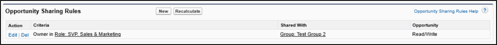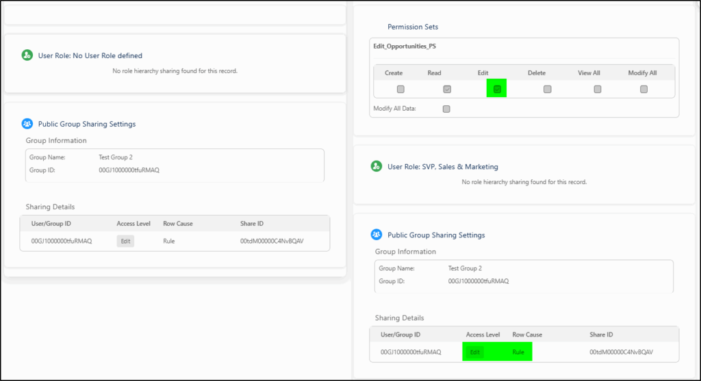 The Public Group (Test Group 2) also gave her access to edit those records owned by the Role SVP, Sales & Marketing via a Sharing Rule (see below).