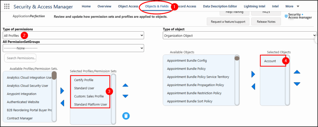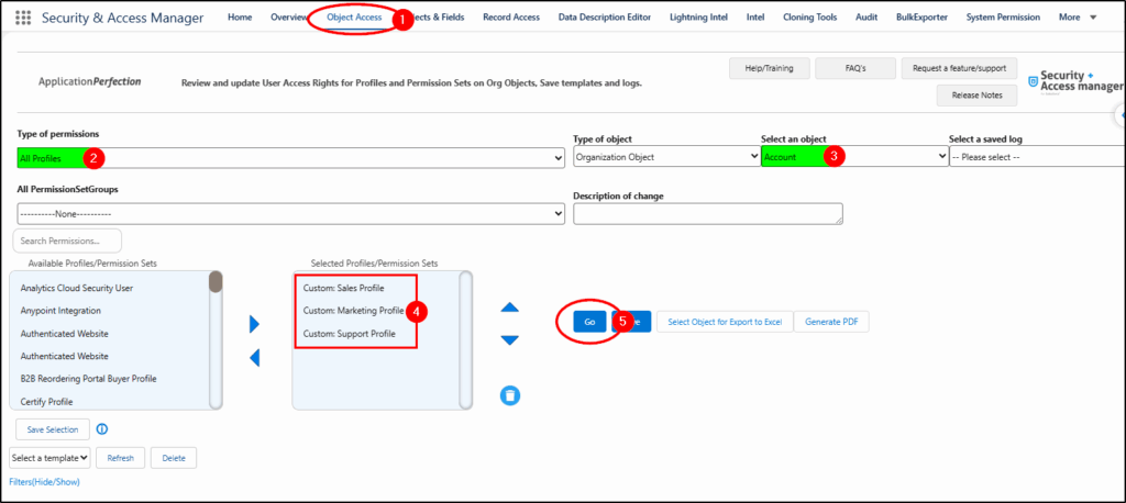 Starting in the Object Access app (1), we select All Profiles (2), choose the Account object (3), and then the three custom profiles we want to investigate (4). Finally, we click Go (5).