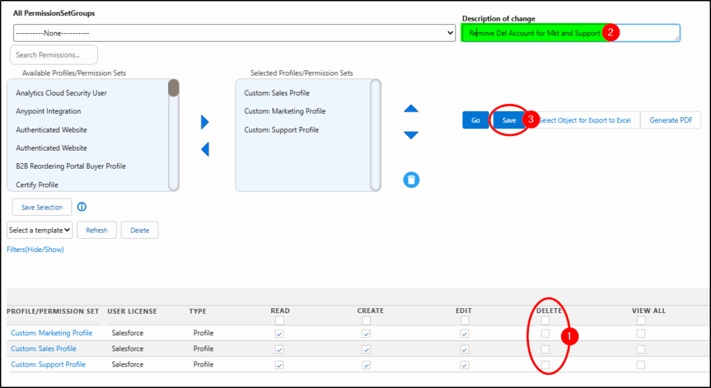 We remove Delete access for the two profiles by unchecking the boxes(1), providing a Description of the change (2), and then saving the changes (3).
