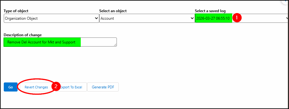 Next, we discovered we made a mistake, so we simply selected a saved log (1) from the drop-down list and reverted the changes (2).
