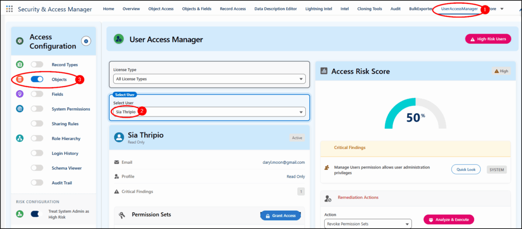 Using Security + Access Manager and the User Access Manager (1) feature, we choose a user (2), select Objects (3), and select the Opportunity object to display.
