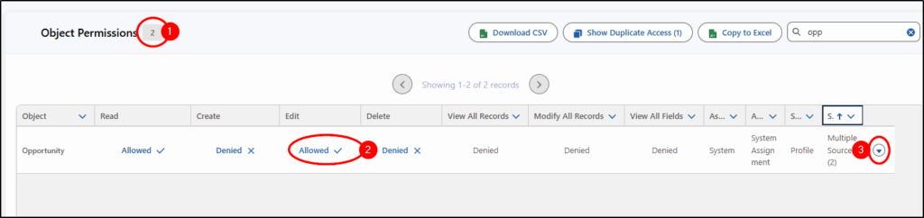 The result shows the combined Object Permissions (1) from all sources. Here we can see that Edit is Allowed (2). There are Multiple Sources found, and by choosing the drop-down arrow on the right (3), we can see exactly which Profile or Permission Set is granting this edit access.