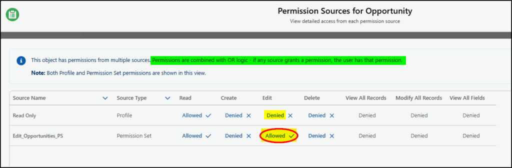 While Sia only had Read access to Opportunities via her Profile (Read Only), the Permission Set (Edit_Opportunities_PS) added Edit access to Opportunities.