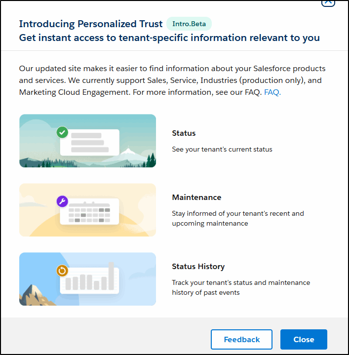 A more personalised version of trust.salesforce.com, the my.trust.salesforce.com brings together the relevant ongoing Events, Maintenance, and Status History, along with additional tabs for Tenant and Subscription information too, allowing you to view them all in one place.