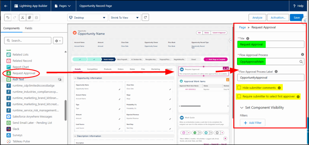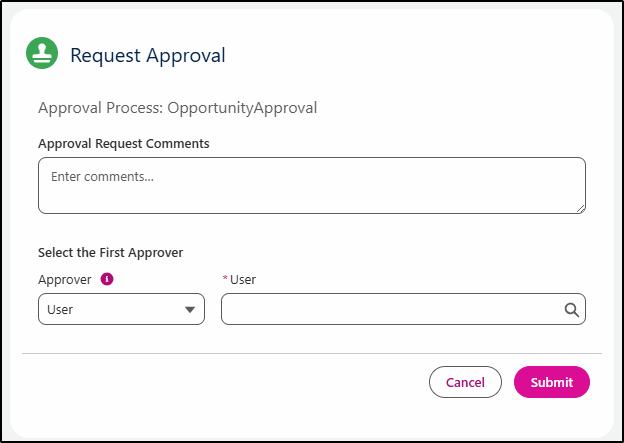 Missing from the new flow-based approval process was a component to add to a Lightning Page that allowed the end user to submit a record for approval (without having to create custom buttons). This has now been delivered in Spring 26 with the Request Approval component that you can add to Lightning Record Pages. This allows you to hide/show the comments from the submitter and can also prompt the user to select the first approver.