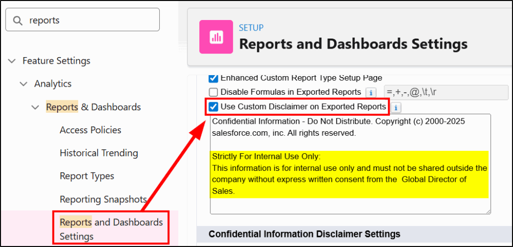 While you can’t replace the standard Salesforce disclaimer on reports, (or easily prevent the export of reports), you can now add a custom message to make it very clear what your company policy is with regard to sharing the information contained in reports extracted from Salesforce.