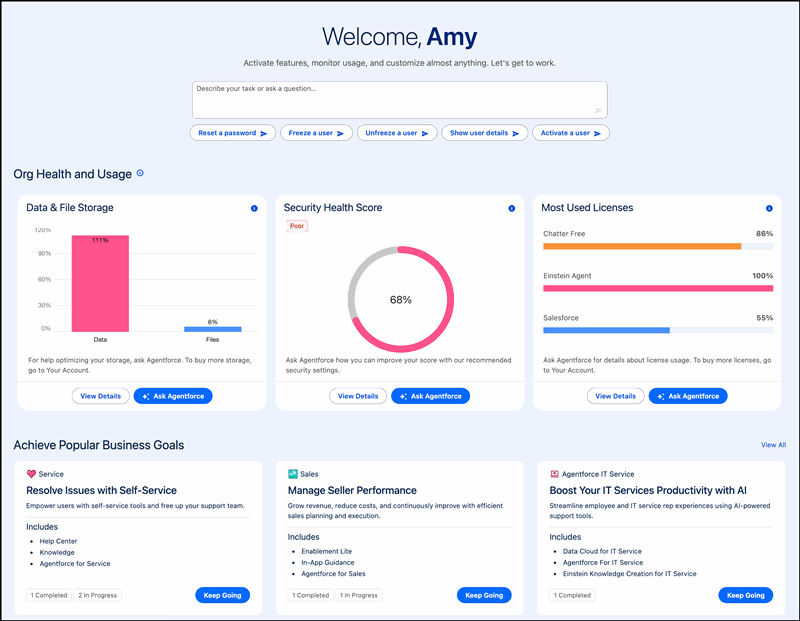 Setup with Agentforce adds a prompt bar, org health and usage metrics, and conversation recommendations to the Setup Home page and gets you started working quickly to complete common tasks.