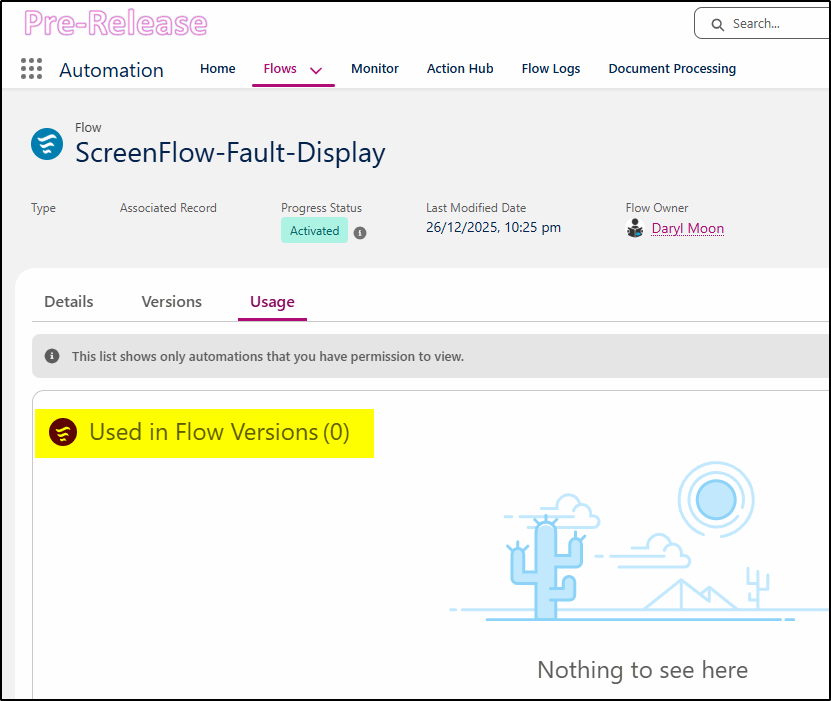 From the Automation App, the new Flows => Usage tab is supposed to show where a flow is being used. I have a screen flow named ScreenFlow-Fault-Display that is called by a number of other screen flows (it handles faults), but it does not show where it is used by other flows. Hopefully, by the time this release reaches production, this issue will be fixed.