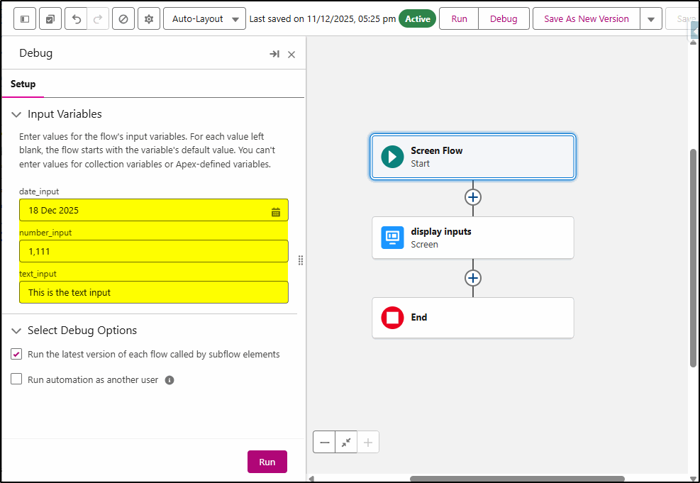 When debugging a flow, the values you have input to test the flow are retained in your browser cache, so the next time they are still there, not need to re-enter values every time you run the debug again.