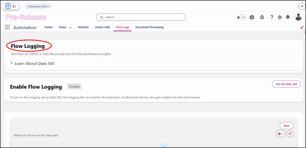 If you have Data Cloud* enabled in your org, you can generate and log metrics in Data Cloud every time you run a flow. This can include completion time, status, and errors, and can be turned on and off for individual flows. Note: Use of this feature does consume Data Cloud credits. This feature is in the Automation app (not from setup).