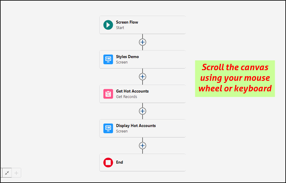 Use your mouse wheel, arrow keys, or Page Up/Page Down to scroll your flows up and down.