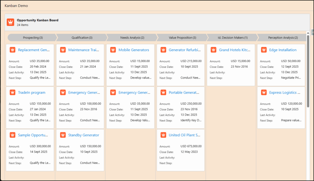 Adding the Kanban Board screen component to your screen flow enables you to have greater control over how you visualize Salesforce records. Include up to five (5) fields and include both header and footer fields.