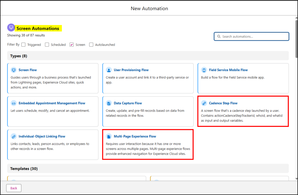 Two new screen flow types came out with the pre-release but only one survived. The Multi-Page Experience Flow, aimed at Experience Cloud flows, seems to have been recalled. Hopefully, it will reappear soon. The other new screen flow type is a Cadence Step Flow. Cadences are a concept associated with complex sales processes.