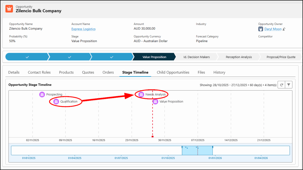 In the record below, it’s easy to see there is a large time gap between the Qualification and Needs Analysis stages – indicating it got stuck in the Qualification process.