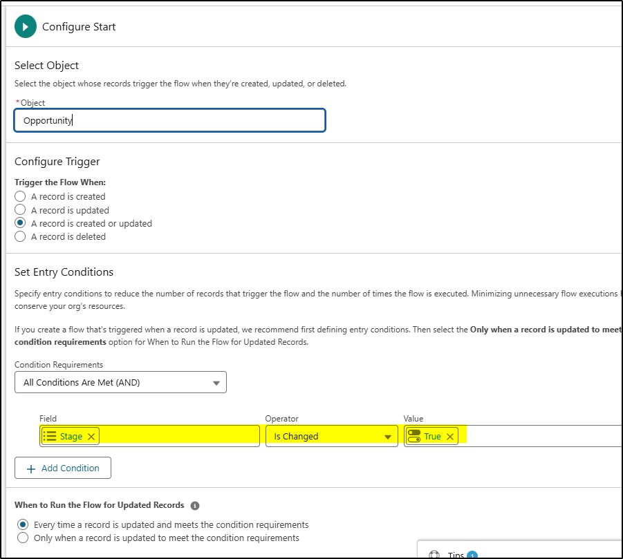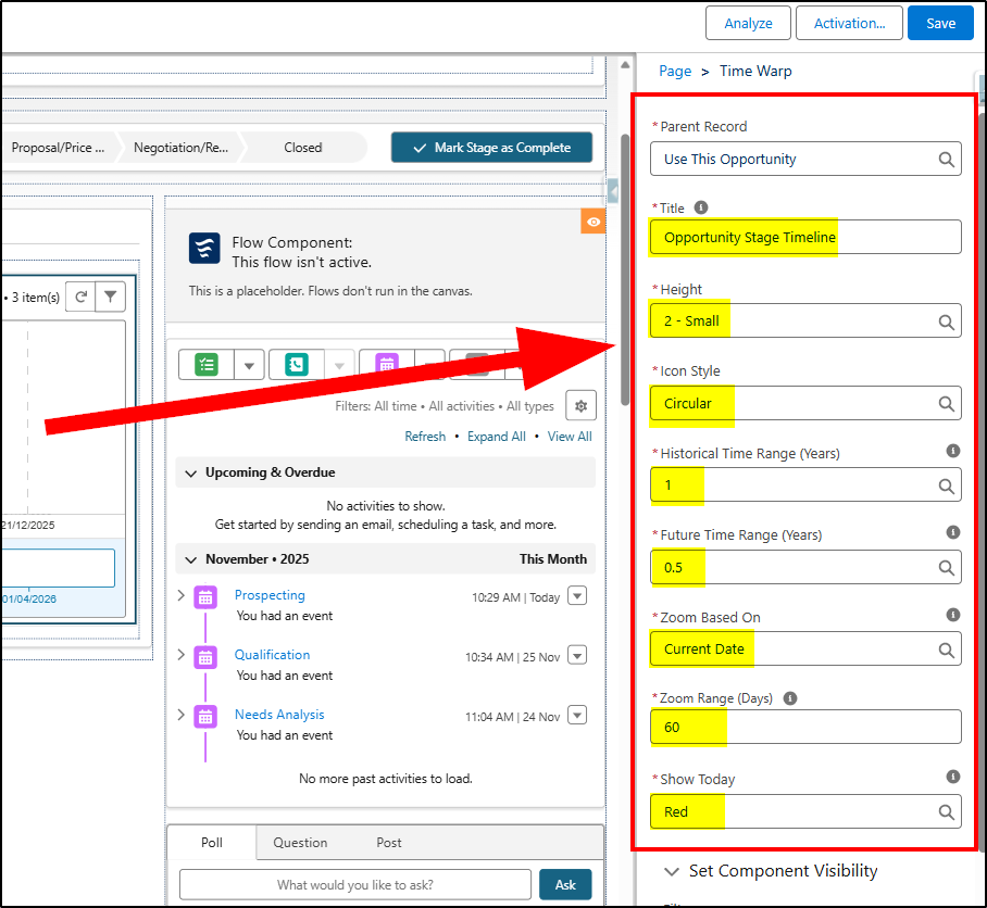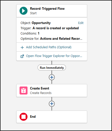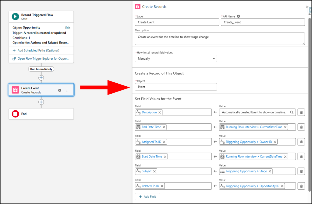 To help solve this, we need some related event records to add to the timeline as shown above. For this, we create a simple Record-Triggered Flow that will create a new event every time the Opportunity stage changes and will relate this event to the Opportunity record.