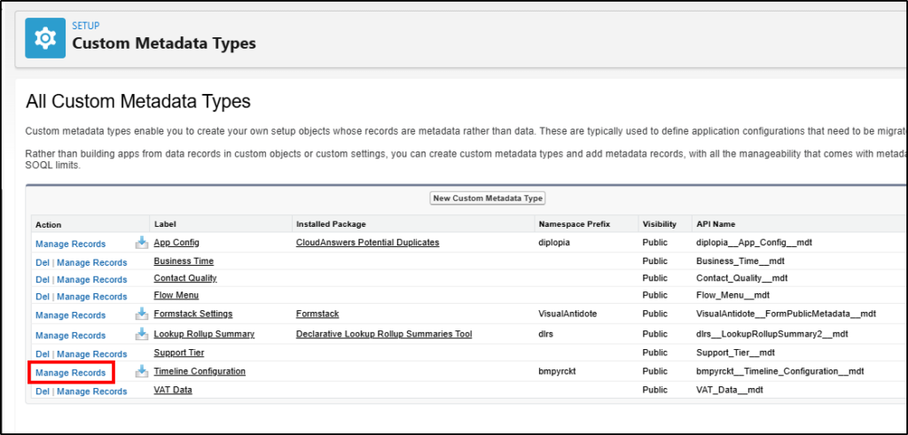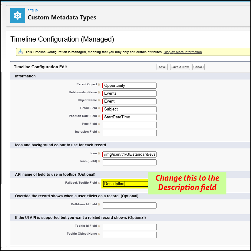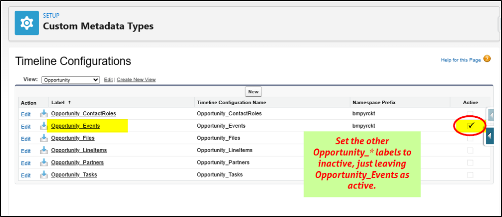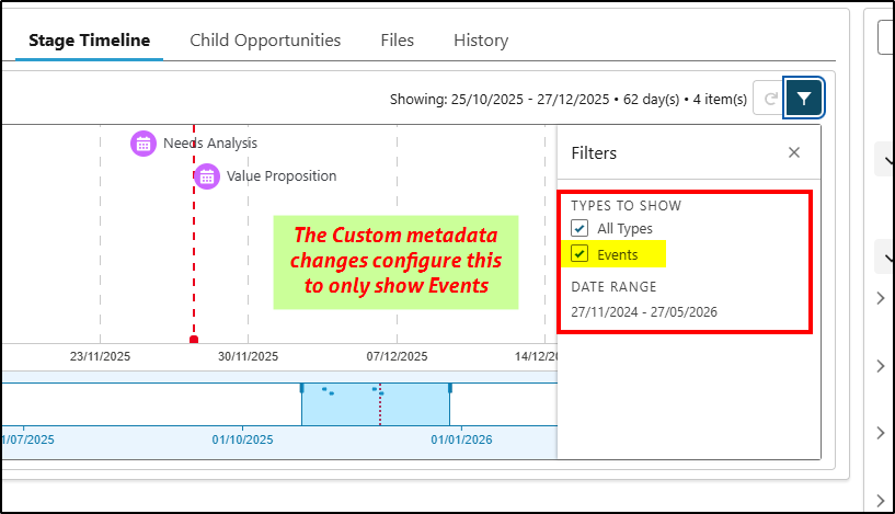 If you don’t make these changes below, the timeline will show all events, tasks and related records. We want to only show the Events for this application. While you can customize this on the UI – every time you open a new record, it defaults back to showing all the events, tasks and related records so you need to configure the custom metadata to make this change permanent.
