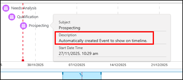 Now choose an opportunity and make some stage changes. If you want, you can manually edit the events created so you can spread them out a bit along the timeline (eg if you want to demo this to a customer with some “realistic looking” data).